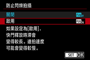 按鈕,選擇[防止閃爍拍攝],然後按下