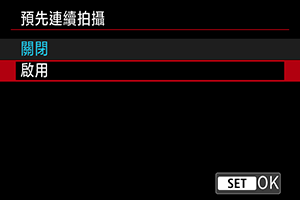 - 啟用預先連續拍攝會關閉閃燈攝影。