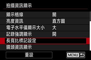 如果您要在編輯記錄的短片時變更長寬比,可以在短片記錄畫面上(待機和記錄期間)顯示最多兩個長寬比標記,以留意編輯後的最終視角。