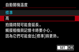 您可以設定相機自動關閉時的最高機身溫度。如果將此溫度設定為高於標準溫度,可以透過消除一些操作限制來延長可用的拍攝時間。