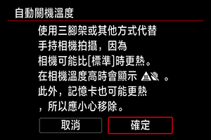 : 自動關機溫度]設為[高]時,相機和記憶卡的溫度可能會進一步升高。