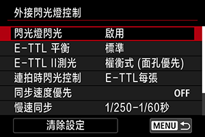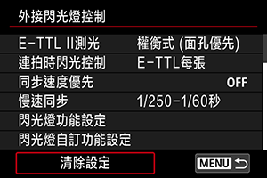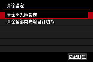 - 選擇[清除閃光燈設定]或[清除全部閃光燈自訂功能]。