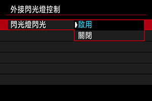 如要啟用閃燈攝影,請設為[啟用]。如只想啟用閃光燈的自動對焦輔助光,設為[關閉]。