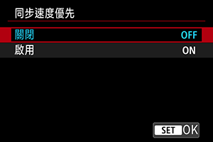 - 將[同步速度優先]設為[啟用]時,在某些拍攝條件下可能曝光不足。