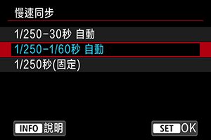 : 外接閃光燈控制]中的[慢速同步]設為[1/*-30秒 自動]*1並使用慢速同步拍攝。