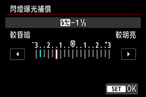 - 如使用閃光燈設定閃燈曝光補償,則無法使用相機設定閃燈曝光補償。如同時使用相機及閃光燈設定閃燈曝光補償,則閃光燈的設定會凌駕相機的設定。