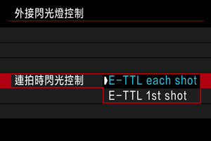 - 設為[E-TTL 第一張]以在連續拍攝前僅為第一張相片執行閃燈測光。第一張相片的閃光輸出量會應用至所有後續的拍攝。優先連續拍攝速度而不需重新構圖時非常有效。