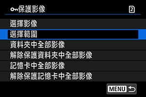 - 透過選擇[記憶卡中全部影像]或[解除保護記憶卡中全部影像]保護或解除保護影像會應用至在[