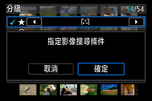 可以根據搜尋條件篩選影像顯示。設定影像搜尋條件後,您只能播放和顯示找到的影像。可以對篩選的影像進行保護、分級、幻燈片播放、刪除以及應用其他操作。