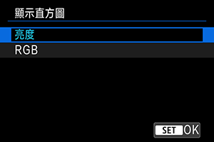 直方圖顯示整個色調範圍的信號量。可進行亮度顯示(用於查看總體的曝光量和整體的色調層次)和RGB顯示(用於查看紅色、綠色與藍色的飽和度和色調層次)。在[: 播放資訊顯示]畫面的左下角中顯示[