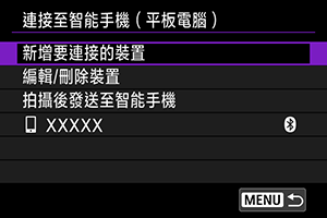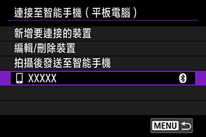 - 無法透過藍牙同時將相機連接至兩台或多台裝置。要切換為其他智能手機進行藍牙連接,請參閱透過Wi-Fi/藍牙重新連接。