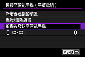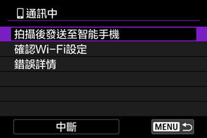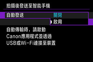 可自動將拍攝的影像發送至智能手機。執行以下步驟前,請先確保相機與智能手機Wi-Fi連接已終止。