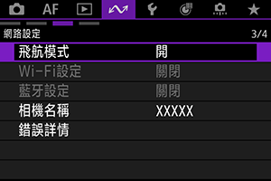 如在相機關閉時不想透過Wi-Fi/藍牙保持連接至相機,將[: 飛航模式]設為[開]或將[