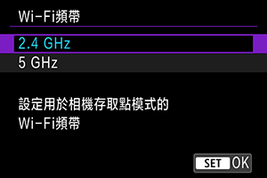 根據需要選擇相機存取點模式的頻帶。此頻帶也適用於使用藍牙功能建立的Wi-Fi連接。