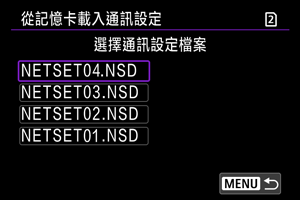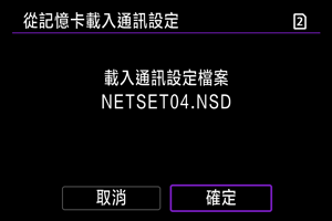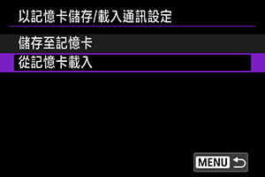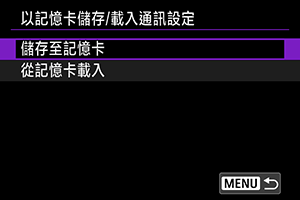 : 以記憶卡儲存/載入相機設定]可將相機中所有的通訊設定儲存至記憶卡或從記憶卡載入其他相機中的所有通訊設定。