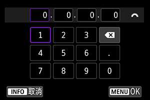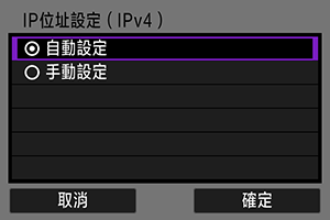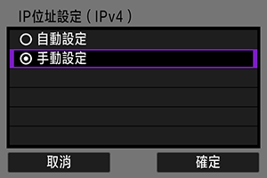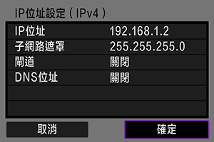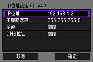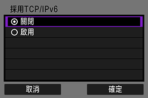 選擇設定IP位址的方式,然後在相機中設定IP位址。使用IPv6時,相機只可透過IPv6進行連接。IPv4連接會關閉。