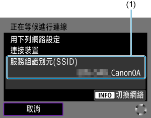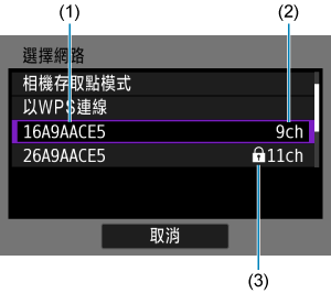 - (2)顯示為空白時表示偵測到多個同名SSID。選擇(2)為空白的SSID會將相機連接至其中信號最強的存取點。