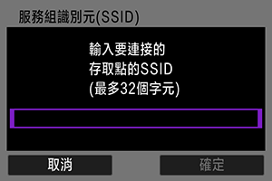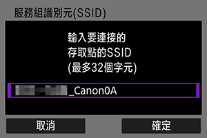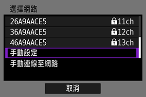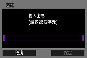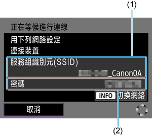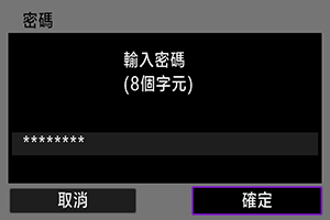 - 在其他裝置的Wi-Fi設定中,選擇相機螢幕上顯示的SSID(網路名稱),然後輸入密碼。