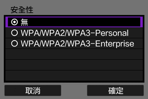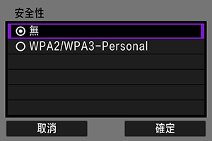 - 其他裝置和本相機上設定的安全性類型必須相同。有關認證和加密類型的詳細資訊,請參閱認證和資料加密方法。