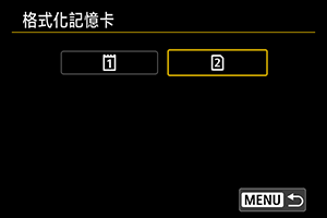 - 格式化記憶卡將刪除記憶卡中的所有影像及資料。即使受保護的影像也將被刪除,所以請確保當中沒有需要保留的影像。必要時,格式化記憶卡前,請將影像及資料傳輸至電腦等。