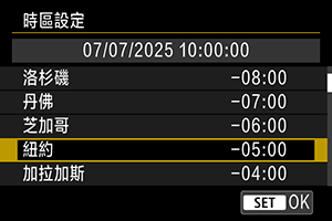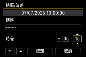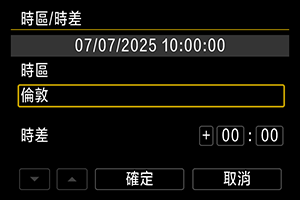 • 如果您所在的時區沒有列出,請按下MENU按鈕,然後在[時差]中設定與UTC(協調世界時)的時差。