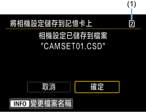 - 記憶卡上最多可儲存十個相機設定檔案。如記憶卡上已有十個相機設定檔案,可覆寫現有檔案,或使用其他記憶卡。