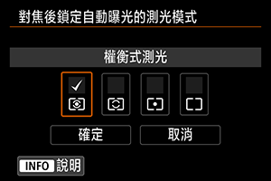 對於每種測光模式,可以指定在使用單次自動對焦合焦主體時,是否鎖定曝光(自動曝光鎖)。持續半按快門按鈕時會鎖定曝光。選擇使用自動曝光鎖的測光模式並添加核取標記[]。選擇[確定]註冊設定。