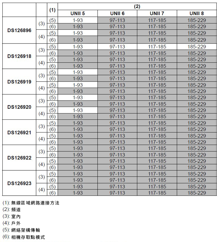 - 當使用無線區域網路時,無法使用下表中灰色的頻道。這些限制由當地法規制定,請務必遵守。