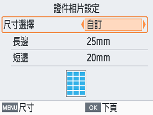 [自訂] 打印前指定長邊及短邊的長度。 [標準] 打印符合國際ICAO標準的相片。 [雙尺寸] 打印兩種尺寸:50x50毫米(約2.0x2.0吋)和45x35毫米(約1.8x1.4吋)。 -