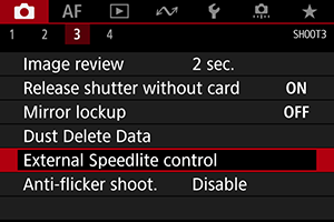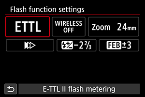 On the camera's [Flash function settings] or [External flash func. setting] screen, you can configure settings for normal flash photography or optical transmission wireless flash photography. For radio transmission wireless flash photography, configure the settings on the Speedlite.