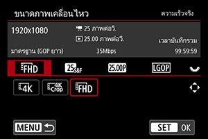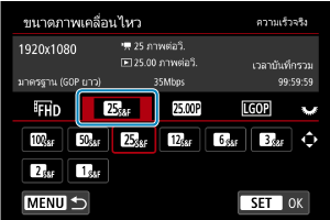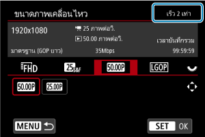 ภาพเคลื่อนไหวที่บันทึกโดยใช้การบันทึกการเคลื่อนไหวช้าหรือเร็วจะถูกเล่นเป็นภาพช้าหรือเร็ว เสียงจะไม่ถูกบันทึก ตั้งค่าความเร็วการเคลื่อนไหวช้าหรือเร็ว (ความเร็วในการเล่น) ใน [: ขนาดภาพเคลื่อนไหว]