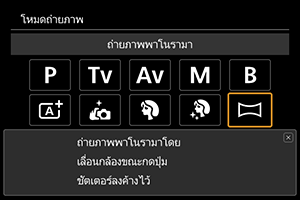 กล้องจะสร้างภาพพาโนรามาจากการรวมภาพที่ถ่ายโดยการถ่ายภาพต่อเนื่องเข้าด้วยกัน เมื่อคุณเลื่อนกล้องไปยังทิศทางหนึ่งในขณะที่กดปุ่มชัตเตอร์ลงจนสุด
