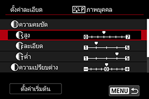 - สำหรับการบันทึกภาพเคลื่อนไหว “*, *” จะแสดงในส่วนพารามิเตอร์ [ละเอียด] และ [ต่ำ] ของ [ความคมชัด] ไม่สามารถตั้งค่า [ละเอียด] และ [ต่ำ] ได้สำหรับการบันทึกภาพเคลื่อนไหว