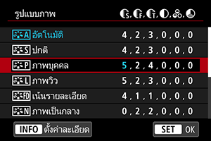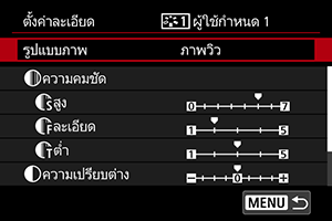 - หากมีการบันทึกรูปแบบภาพภายใต้ [User Def. *] อยู่แล้ว การเปลี่ยนแปลงรูปแบบภาพพื้นฐานจะลบการตั้งค่าพารามิเตอร์ของรูปแบบภาพที่ผู้ใช้กำหนดและบันทึกไว้ก่อนหน้านี้