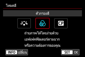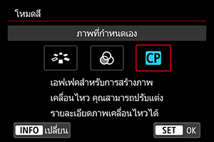 คุณสามารถตั้งค่าลักษณะของภาพเคลื่อนไหวหรือภาพนิ่งที่ต้องการได้จากเมนูรูปแบบภาพ ตัวกรองสี หรือภาพที่กำหนดเอง