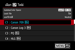 - ไม่สามารถใช้ Look File ที่บันทึกได้หากคุณเปลี่ยนการตั้งค่า [Gamma/Color Space], [HLG Color] หรือ [Over 100%] หลังจากการบันทึก