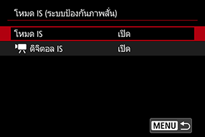 เปิดใช้งานการป้องกันภาพสั่นไหวโดยใช้เลนส์ IS แสดงขึ้นเมื่อใช้เลนส์ IS ที่ไม่มีสวิตช์ IS ไม่แสดงสำหรับเลนส์อื่นๆ
