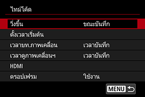 คุณสามารถเลือกวิธีแสดงเวลาบนหน้าจอการถ่ายภาพเคลื่อนไหว