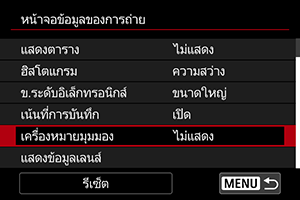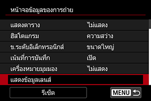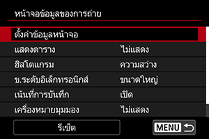 คุณสามารถกำหนดรายละเอียดและหน้าจอข้อมูลที่แสดงบนกล้องขณะถ่ายภาพ