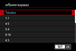 หากคุณจะเปลี่ยนอัตราส่วนภาพเมื่อแก้ไขภาพเคลื่อนไหวที่บันทึกไว้ คุณสามารถแสดงเครื่องหมายมุมมองบนหน้าจอบันทึกภาพเคลื่อนไหว (ระหว่างสแตนด์บายและการบันทึก) เพื่อให้ทราบถึงมุมรับภาพสุดท้ายหลังจากแก้ไข