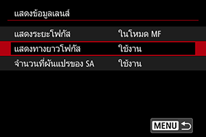 คุณสามารถแสดงระยะโฟกัส เมื่อใช้เลนส์ RF ในการแสดงระยะโฟกัส คุณสามารถเลือกเวลาและหน่วยของการวัด