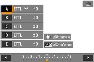 เพื่อเลือกกลุ่มแฟลช (A–E) ที่จะกำหนดค่า
