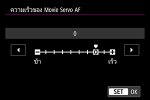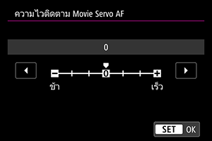 คุณสามารถปรับความเร็ว AF (ความเร็วการเปลี่ยนโฟกัส) จากความเร็วมาตรฐาน (0) ถึงช้า (หนึ่งในเจ็ดระดับ) หรือเร็ว (หนึ่งในสองระดับ) เพื่อให้ได้ผลที่ต้องการสำหรับการสร้างภาพเคลื่อนไหว