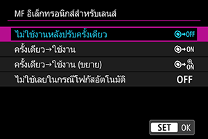 สำหรับเลนส์ที่มีระบบโฟกัสด้วยตนเองแบบอิเล็กทรอนิกส์ คุณสามารถระบุวิธีการปรับโฟกัสด้วยตนเองที่ใช้กับ AF ครั้งเดียว