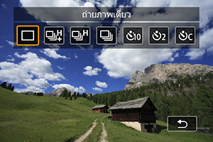 เมื่อคุณกดปุ่มชัตเตอร์ลงจนสุดค้างไว้ คุณสามารถถ่ายภาพต่อเนื่องได้ตามที่อธิบายด้านล่างนี้ในขณะที่กดปุ่มค้างไว้ โดยใช้การตั้งค่า [