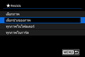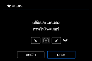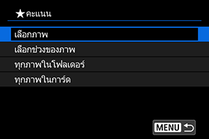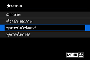 : คะแนน] เมื่อคุณเลือก [ทุกภาพในโฟลเดอร์] หรือ [ทุกภาพในการ์ด] ภาพทั้งหมดในโฟลเดอร์หรือในการ์ดจะถูกให้คะแนน