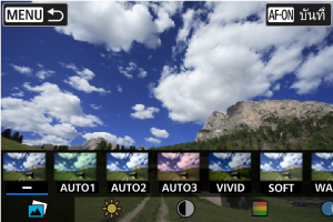 คุณสามารถเลือก [VIVID], [SOFT] หรือเอฟเฟคที่ตั้งไว้ล่วงหน้าอื่นๆ [AUTO1], [AUTO2] และ [AUTO3] เป็นเอฟเฟคที่กล้องแนะนำตามสภาวะของภาพ