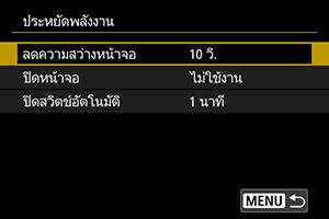 - [ลดความสว่างหน้าจอ] และ [ปิดหน้าจอ] มีผลขณะแสดงหน้าจอถ่ายภาพ การตั้งค่าเหล่านี้ไม่มีผลระหว่างการแสดงเมนูหรือการเล่นภาพ