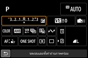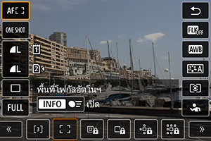 ใช้หน้าจอ [การแสดง 1] ตามที่อธิบายไว้ใน การควบคุมทันใจในการถ่ายภาพนิ่งหรือการเล่นภาพ ใช้หน้าจอ [การแสดง 2] ดังต่อไปนี้
