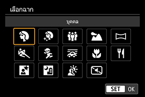 ให้เลือกโหมดถ่ายภาพหลังจากแตะที่ไอคอนทางซ้ายบนหรือเข้าถึงหน้าจอ [เลือกฉาก] ใน [